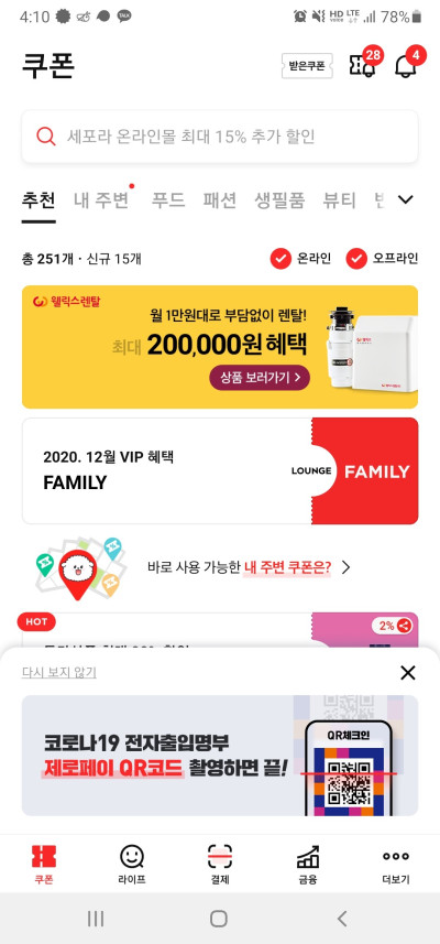 아이폰 화면인데 페이코 앱에서 결제를 누르면 PAYCO 결제 / 삼성페이 / QR 결제 세 종류가 나와야 하지만 나오지 않는 상황입니다. 이유는 간단한데 3G 요금제를 사용하고 있으며 셀룰러 데이터를 정상적으로 사용할 수 없는 휴대폰이기 때문입니다. 하지만 갤럭시 휴대폰으로 재현할 수 있으므로 아래 사진을 참고해주시기 바랍니다.