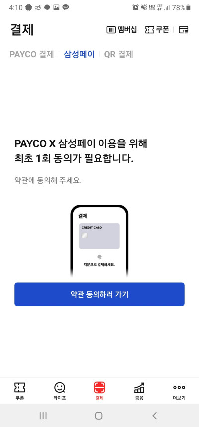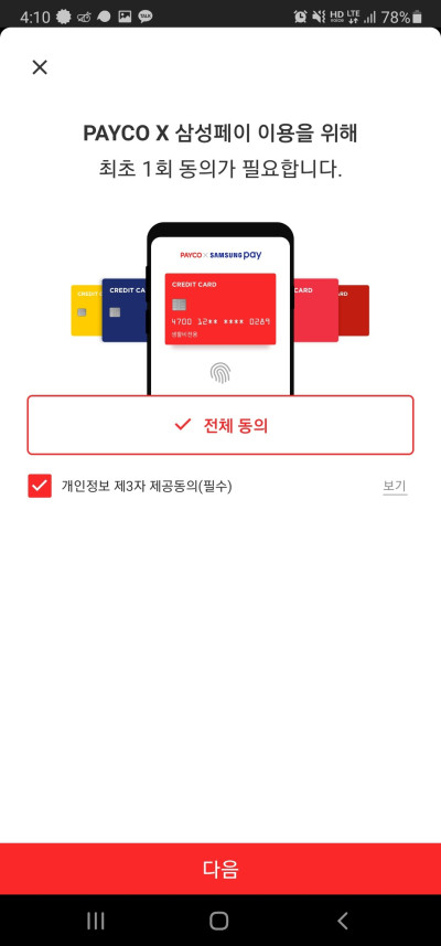 갤럭시 휴대폰을 이용하여 페이코 앱에서 결제를 누른 모습인데 삼성페이 이용을 위해 최초 1회 동의가 필요하다고 합니다.