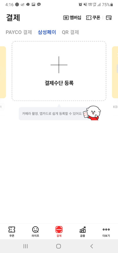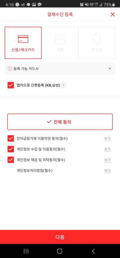 동의를 하고 기존 삼성페이를 사용하기 위한 결제수단 등록을 진행합니다.