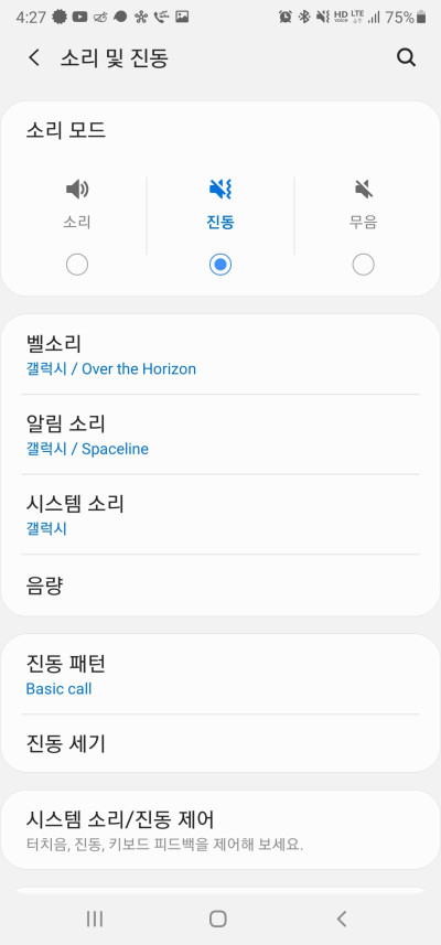우선 진동 설정을 하기위해 설정의 소리 및 진동으로 이동하여 시스템 소리/진동 제어를 선택합니다.