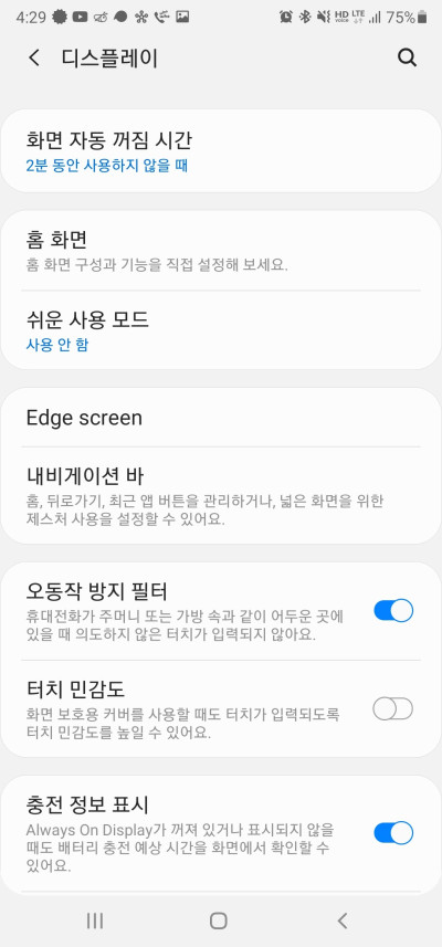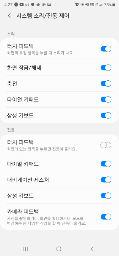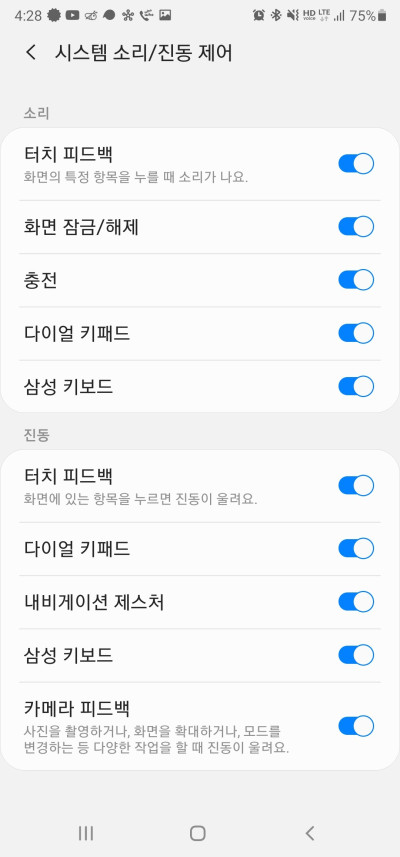 여기서 터치 피드백이 기본상태가 비활성화로 되어 있는데 활성화를 해줌으로서 네비게이션바 터치시 진동형태로 변경할 수 있습니다. 해당 기능이 불편하신 분들은 과정을 건너뛰고 다음 과정으로 이동해주시기 바랍니다.
