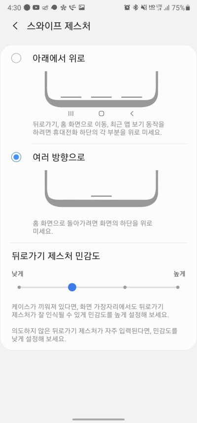 스와이프 제스쳐의 옵션 더보기를 누르면 아래에서 위로와 여러방향으로 두가지 중 하나를 선택할 수 있는데 개인적으로는 여러 방향으로를 사용하는 사람을 한번도 본 적이 없으며 대부분 아래에서 위로를 사용하고 있었습니다. 본인이 원하는 설정을 진행하면 되겠죠?