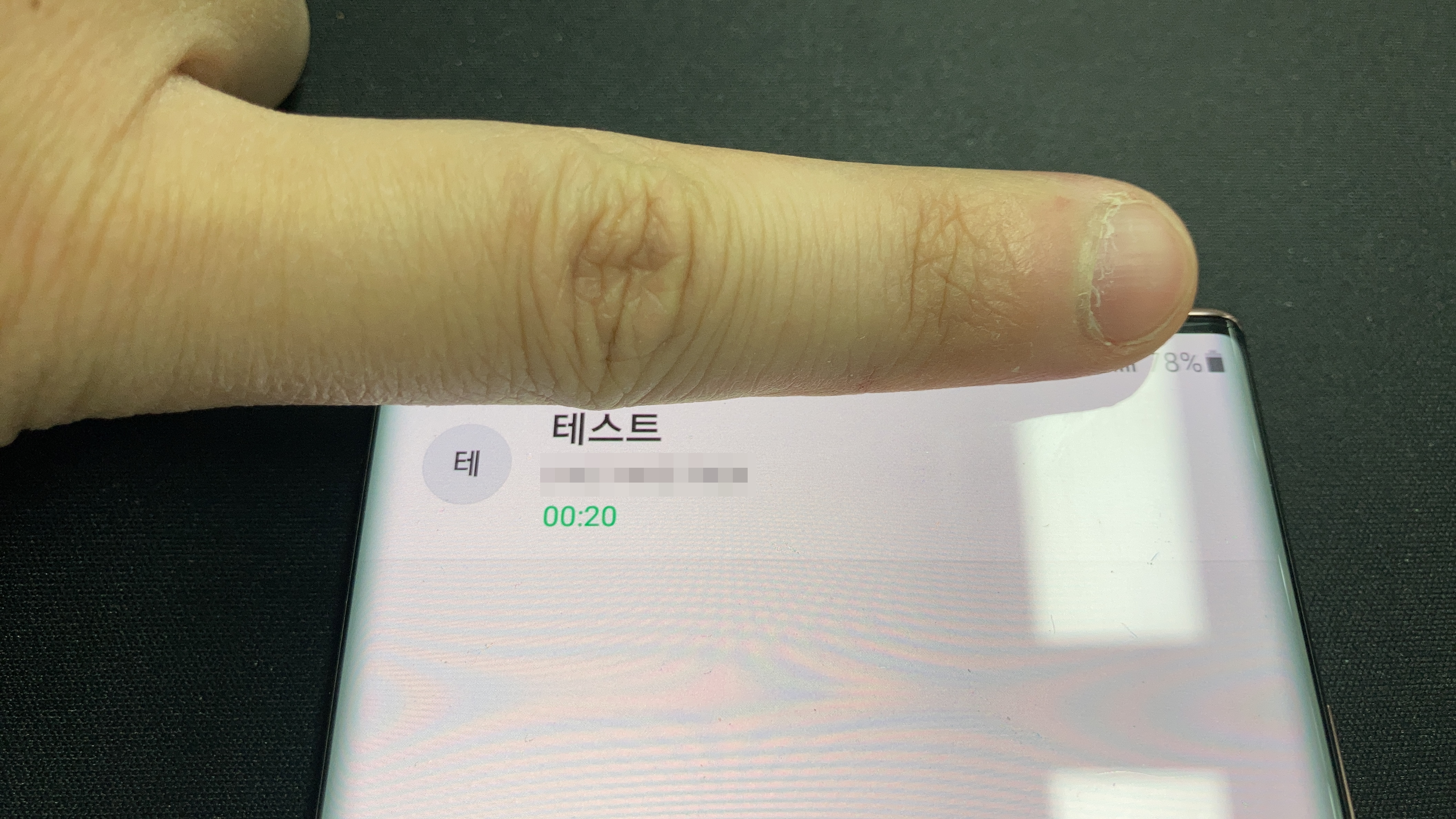 근접센서 위치는 대략 이곳에 있는데 이렇게 손으로 누르면 전화통화 상태에서 휴대폰 화면이 꺼져버립니다. 말 그대로 화면만 꺼진 것일 뿐 다시 켠다고 해서 사용자 인증(지문/패턴)을 요구하지는 않습니다.