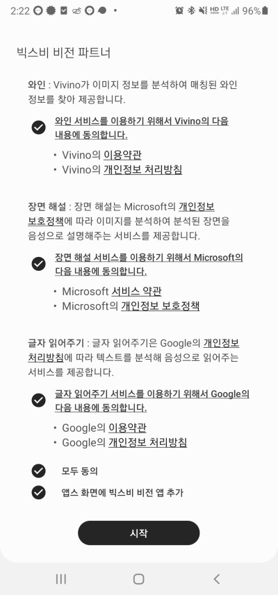 빅스비 비전 사용을 환영합니다 라고 나오며 약관동의 및 시작을 누릅니다.