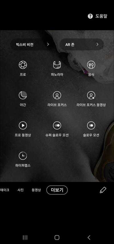 카메라 앱을 켜고 우측 더보기를 선택하면 위에 빅스비 비전이 있는데 그것을 누릅니다.