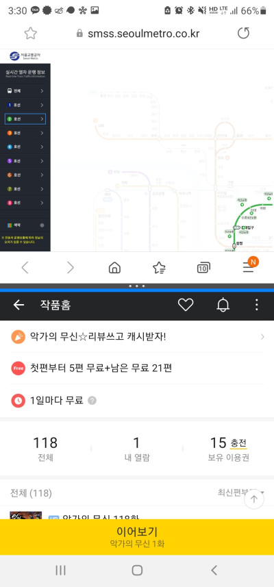 카카오페이지 및 유튜브 앱을 켜봤는데 멀티윈도우 화면을 정상적으로 사용할 수 있었습니다. 하지만 100% 모든 앱이 멀티윈도우 적용이 되는 것이 아니기 때문에 본인이 사용하는 앱의 멀티윈도우 가능 여부를 확인해야 합니다. 만약 사용이 불가능하더라 하도 강제로 멀티윈도우를 적용시키는 방법은 아직까지 없는것으로 알고 있습니다.