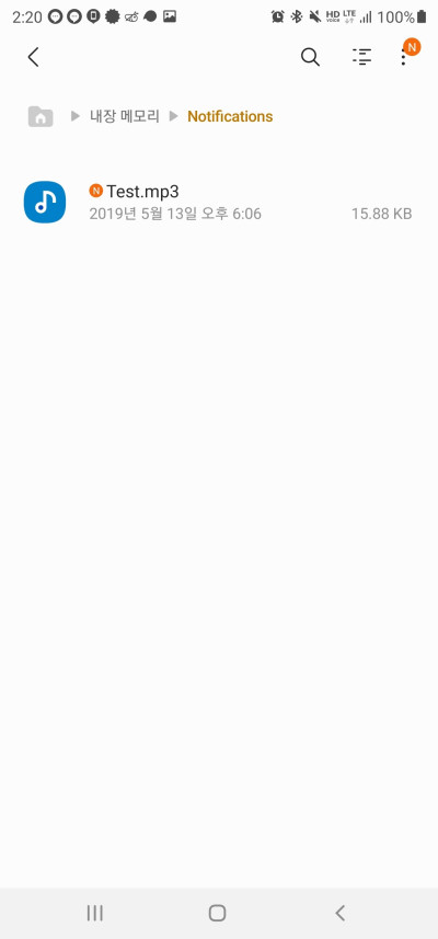 이 상태에서 다시 되돌아가보면 Test 파일이 알림음으로 존재하는 것을 알 수 있는데요 중요한 것은 해당 커스텀된 파일 우측에 있는 - 버튼을 누르면 파일이 사라지며 Notifications 폴더에 있던 파일도 같이 사라진다는 것입니다.
