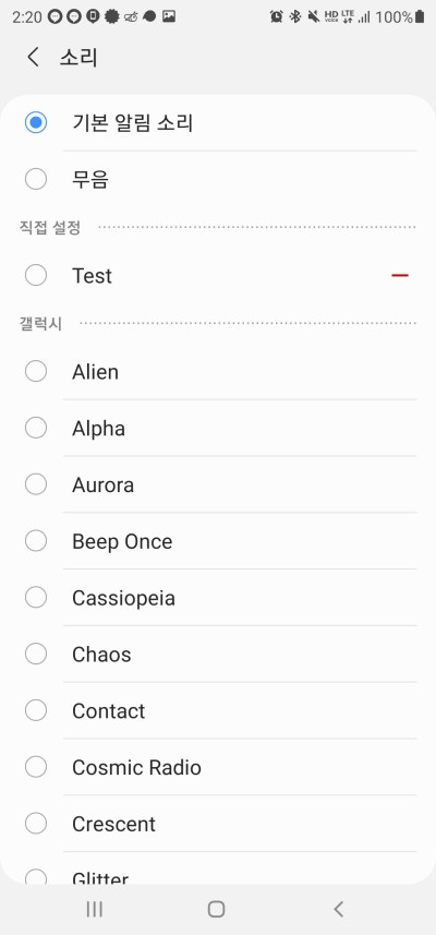 여기서 소리로 설정되어 있는지 확인한 다음 중간에 있는 소리를 누르면 소리를 선택할 수 있습니다. 기본음이 한 20여가지 되기 때문에 본인이 원하는 음을 선택할 수 있고 따로 벨소리용 음원(mp3)이 있다면 커스텀으로 설정 할 수 있습니다.