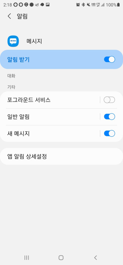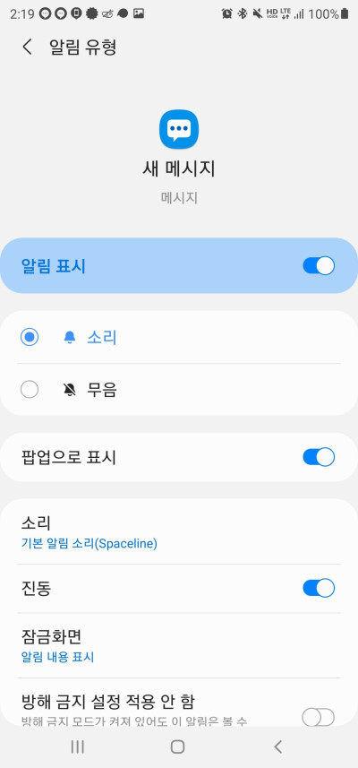 메시지 설정이 나오는데 알림을 선택하면 몇가지 메뉴가 나오는데 여기서 새 메시지를 누릅니다.
