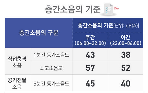 본인이 층간소음이 있다고 해서 무조건 신고가 가능한 것이 아닌 일정 기준이 존재하는데 해당 기준은 아래와 같습니다.