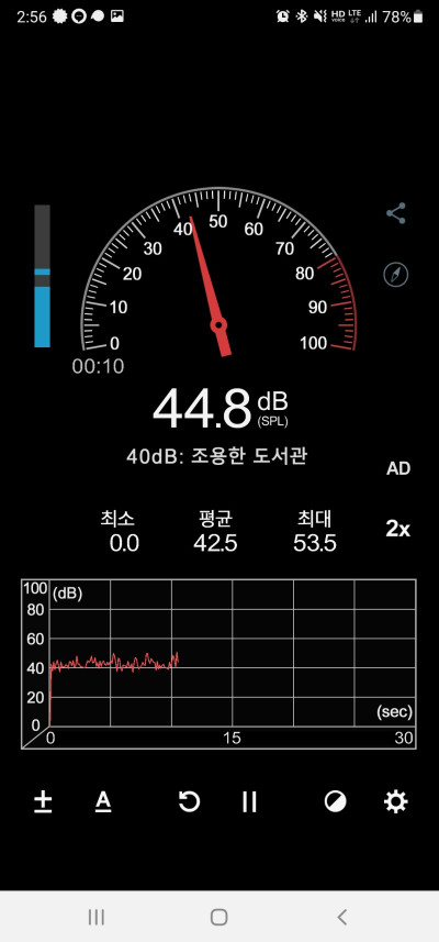 해당 앱으로 제가 근무하는 사무실 내부에서 측정해봤습니다. 30 중후반대에서 40대를 왔다갔다 하는데 집에서 이정도면 야간이 아닌 이상 소음이라 말하기에는 조금 애매한 수치겠죠?