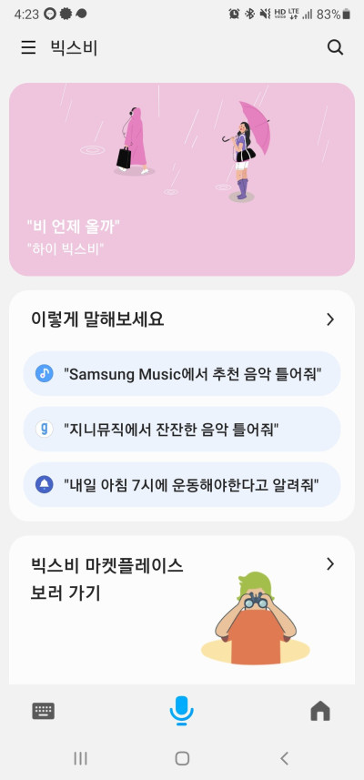 작업이 끝났다면 휴대폰 메인화면에서 '하이 빅스비'라고 부르면 휴대폰 하단에 작대기가 보이더니 마이크 모양으로 변합니다. 그리고 원하는 내용을 말하면 정보를 검색해주기도 하지만 아무말이 없다면 그대로 마이크가 사라지며 상황이 종료됩니다. 빅스비를 호출할때는 블루투스 이어폰을 착용한 상태로 불러도 정상적으로 작동합니다.