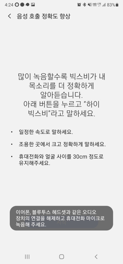 음성 호출 정확도 향상 작업은 블루투스 기기(이어폰)가 연결된 상태에서 진행이 불가능하기 때문에 잠시 해제시켜야 합니다.
