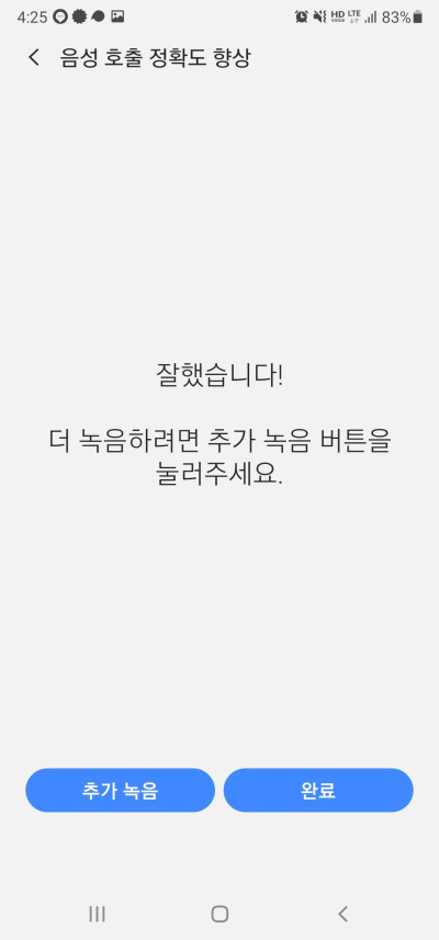 두번의 빅스비 녹음이 진행되는데 무조건 '하이 빅스비'로 녹음해야 하며 추가녹음도 가능하지만 일단 테스트작업이기 때문에 이대로 완료하겠습니다.