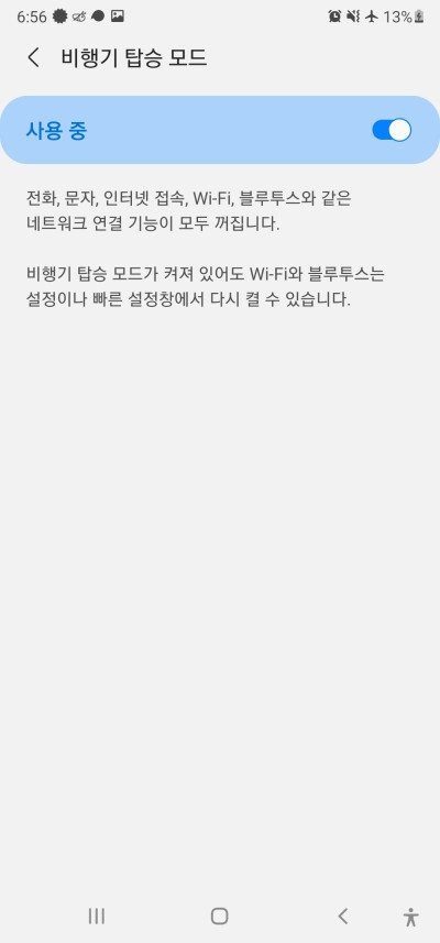 먼저 비행기 탑승모드를 활성화합니다. 간단한 안내를 보면 비행기 탑승 모드가 켜져 있어도 와이파이와 블루투스는 켜서 사용이 가능하다고 나와 있습니다.
