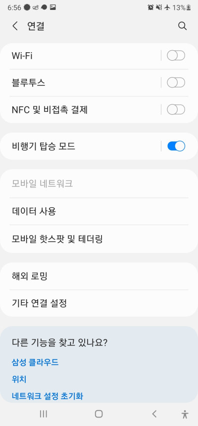 설정에서 연결로 들어가면 Wi-Fi / 비행기 탑승 모드가 보이는 것을 알 수 있습니다.