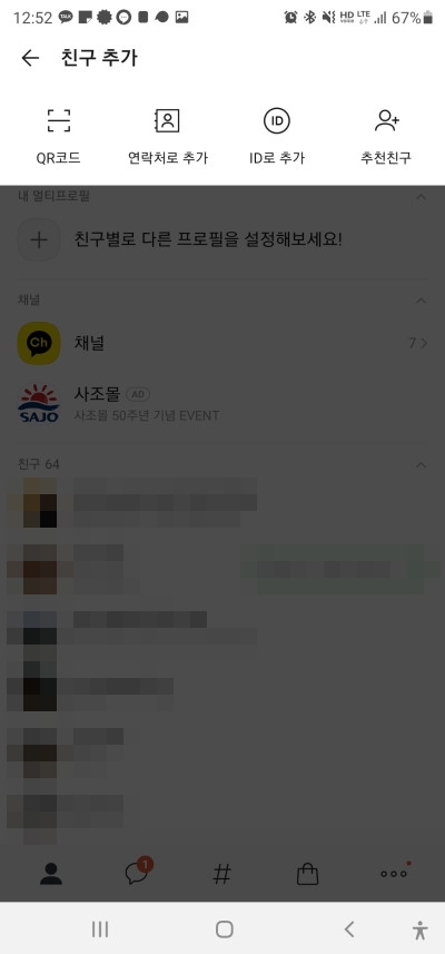 위 작업을 마쳤다면 카카오톡 차음으로 돌아와 친구추가를 누군지 모르는 번호로 진행해봅니다.
