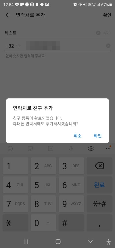 친구추가가 즉시 이루어졌지만 상대방의 휴대폰에는 본인이 친구추가를 한 것을 알 수 없습니다. 여기까지 한 뒤 프로필같은걸 보면 상황에 따라 누구인지 유추할 수 있습니다.