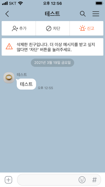 만약 그럴일은 없겠지만 메세지를 보내보면 받는 쪽에서는 이렇게 이렇게 메세지가 뜨면서 추가/차단/신고 세가지 메뉴가 나오는 것을 알 수 있습니다. 테스트로 진행했기 때문에 삭제한 친구라고 뜨는 게 보이시죠?