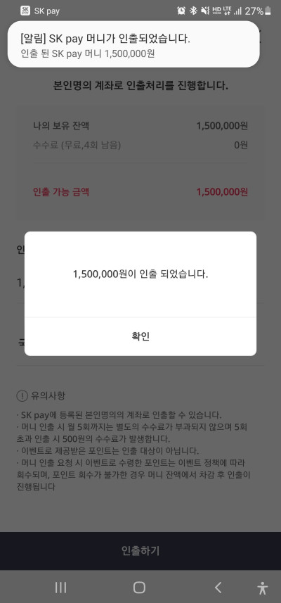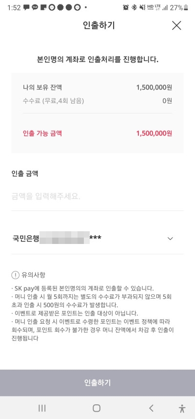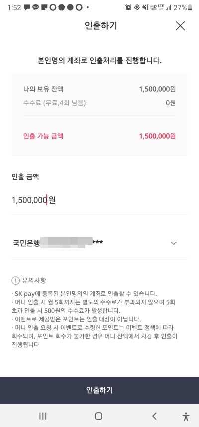 인출하기를 누르면 즉시 연결된 계좌로 해당금액이 인출됩니다. 참쉽죠?