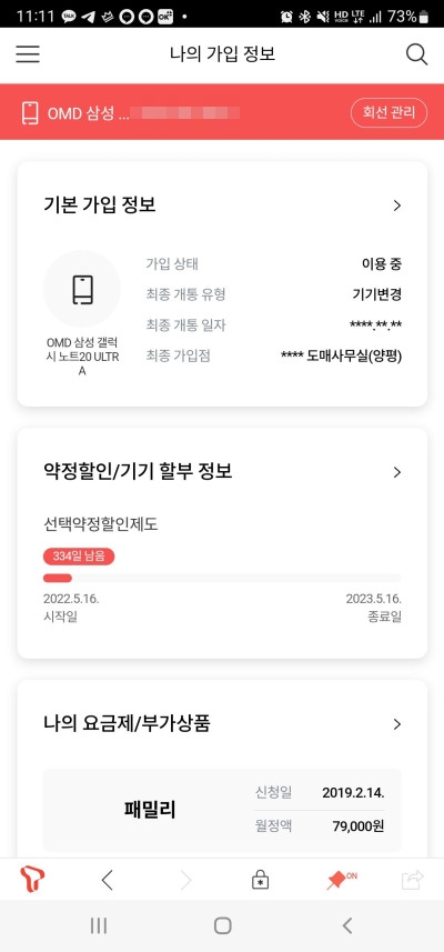 위와 같은 상황에서 단말기 할부정보 관련 항목이 보일 경우 본인의 휴대폰에 할부원금이 남아 있다는 의미이며 그렇지 않고 저와 같은 형태로 되어 있다면 있다면 가입 후 24개월이 지나 단말기 할부원금은 모두 납부되었거나(5GX클럽 제외) 자급제 또는 중고 휴대폰을 등록한 상태라고 생각하시면 됩니다.