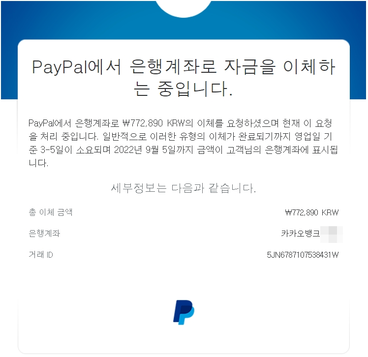 이체 과정을 마쳤다면 이렇게 메일로 'PayPal에서 은행계좌로 자금을 이체하는 중입니다' 라고 나오며 계산된 환율에 대한 이체금액과 기타 세부정보가 나오게 됩니다. 제시된 화면은 600달러를 이체 요청했는데 환율에 의해 약 3만원정도 차감된 것 같습니다. 달러를 사고팔때보다 수수료가 약간 더 쎈 듯한 느낌입니다.