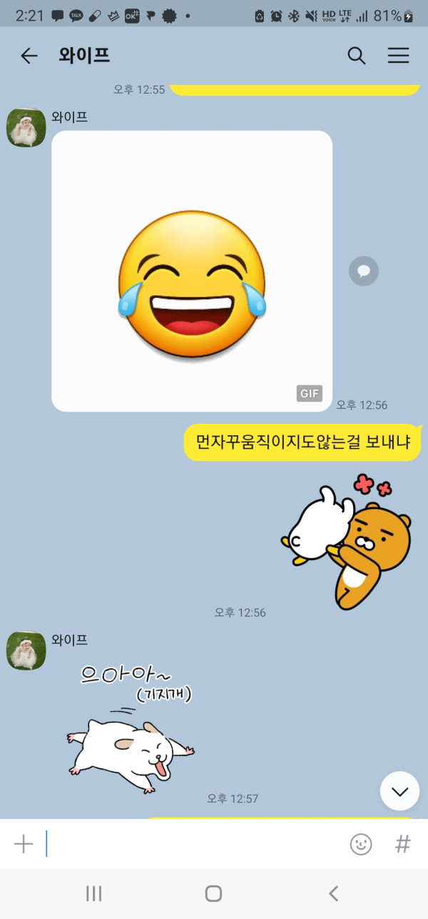 의도한 것은 아니며 어쩌다보니 와이프와의 채팅이 이렇게 되었는데 상단의 움짤을 보면 오른쪽 하단에 GIF라고 되어 있으며 첫화면에서 움직이지 않는 것을 알 수 있습니다. 하단의 유료 이모티콘 역시 움직이지 않긴 하지만 이것은 이렇게 의도적으로 판매가 된 것이므로 더는 논하지 않겠지만 움짤을 한번 누르면 화면 전환이 되며 그제서야 움직이게 됩니다. 당연히 본인들이 만든 무료 이모티콘은 잘 움직이죠.