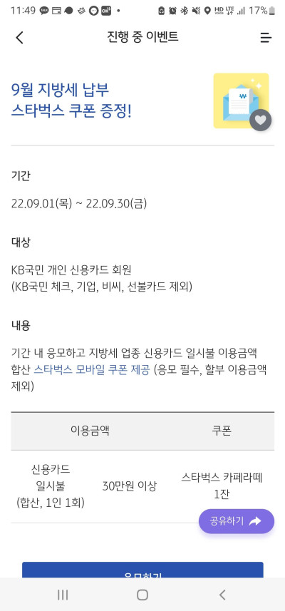 // 신용카드 30만원 이상 이용시 스타벅스 카페라떼 1잔 제공 //