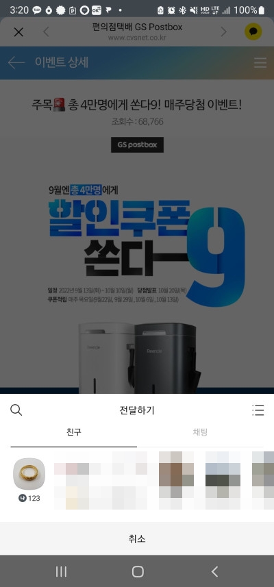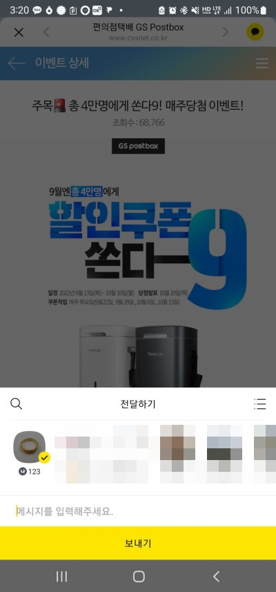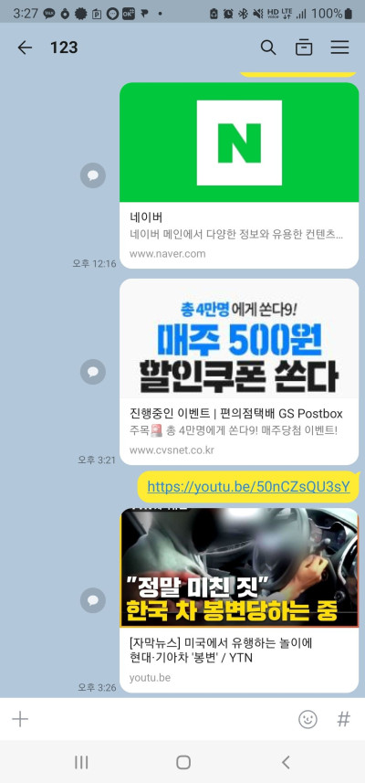 우측하단 전달하기 버튼을 통해 내 계정으로 링크를 보냅니다.