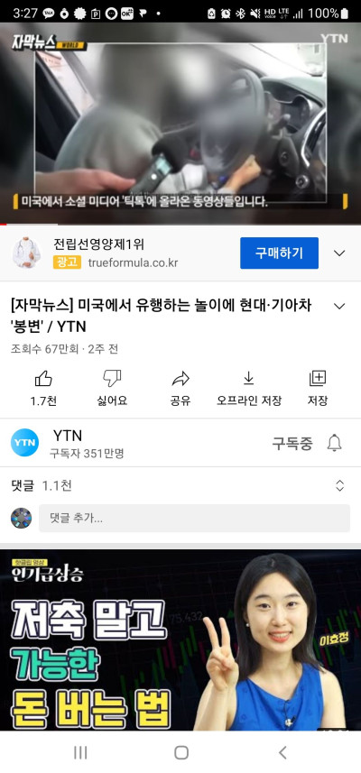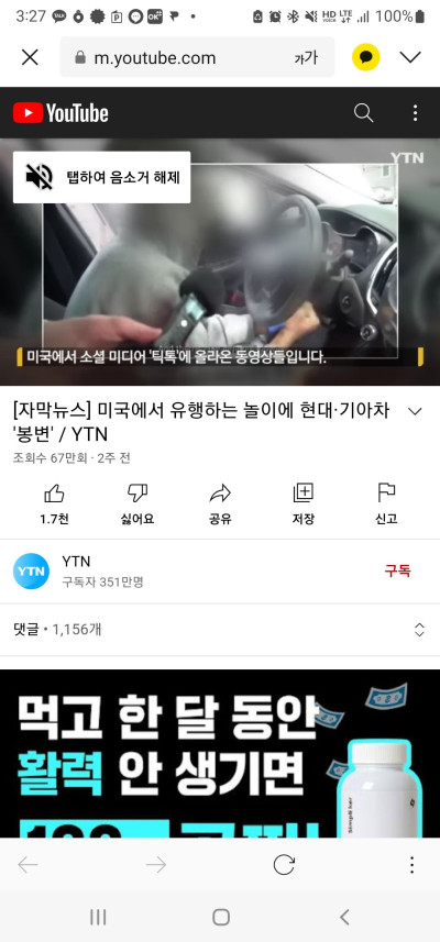 유튜브 앱으로 열린 모습입니다. 너무 불편합니다.