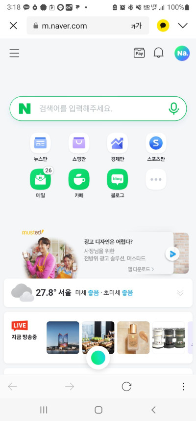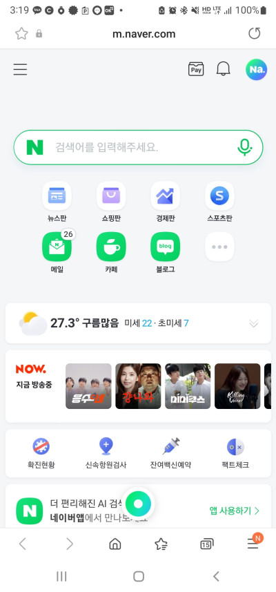 네이버 링크를 열게 되면 이런식으로 자체 브라우저로 열리게 됩니다.