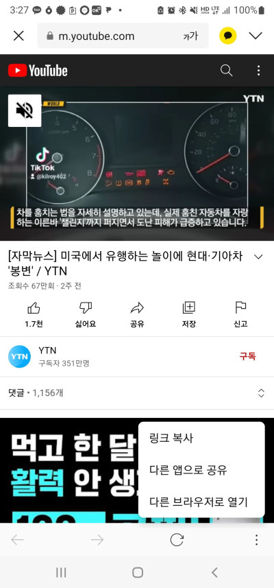 링크를 열면 자체 브라우저로 유튜브가 열리는데 동일하게 우측 하단 점표시를 누르고 외부 브라우저를 선택해야 합니다.