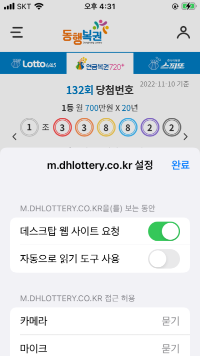 기존방법을 먼저 알려드리자면 동행복권 홈페이지로 접근하여 좌측 하단의 '가'를 누르고 데스크탑 웹 사이트 요청을 눌러 화면을 PC버전으로 전환시켜 줍니다.