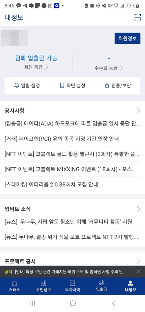 업비트에서 메타마스크 개인지갑 등록을 위한 과정은 다음과 같습니다. 내 정보에서 회원정보를 누르고 개인정보 관리에서 개인지갑 주소 관리를 선택합니다.