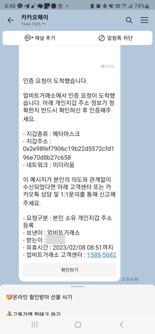 메타마스크 앱이 열리고 로그인 후 업비트와의 연결 메세지가 나오는데 연결을 누르면 '본인 소유의 개인지갑을 등록해주세요' 라고 나옵니다. 2채널 인증하기를 누릅니다.