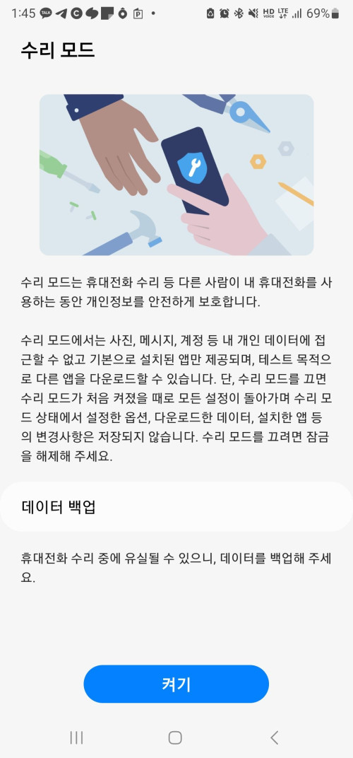 일부 뉴스기사에서 수리를 하는 중 휴대폰 데이터가 유출되는 사건을 간혹 본적이 있는데 그래서였을까요? 휴대폰에도 수리모드라는 것이 등장했습니다. 해당 옵션은 안드로이드 13 Oneui 5.0 버전이 적용되지 않은 구형 휴대폰에서는 적용할 수 없으므로 사용상에 참고 부탁드립니다.