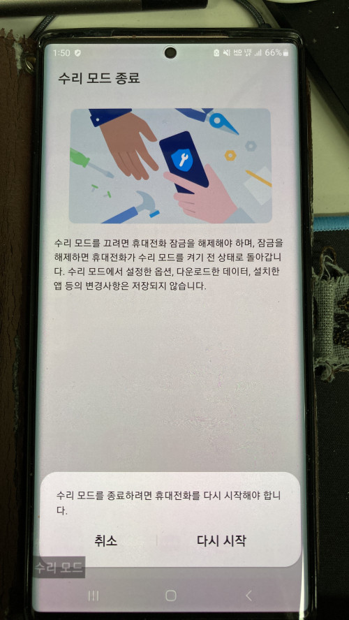 하단바를 내려서 팝업창을 누르면 수리모드 종료가 가능합니다.