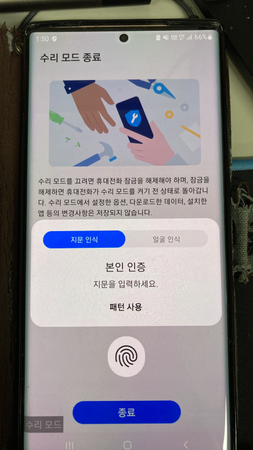 종료버튼을 누르면 휴대전화를 다시시작하라고 요구하며 지문인증 과정이 진행됩니다. 해당 작업을 하지 않고 휴대폰을 재부팅하면 수리모드에서 기존 일반환경으로 돌아올 수 없는데 수리중 악의적인 행동을 하는 사람을 막기 위한 조치가 아닐까 싶습니다.