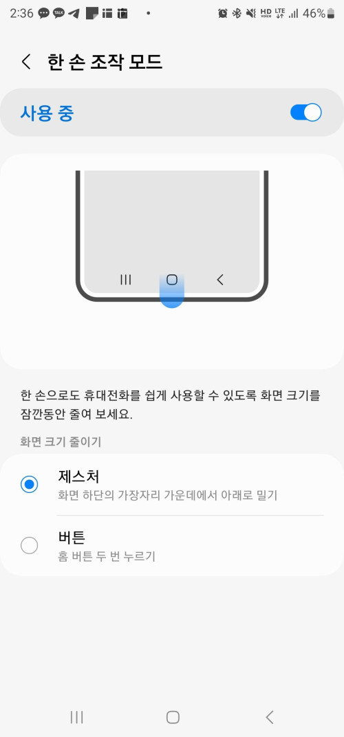 설정에서 유용한 기능으로 이동하여 한손 조작모드를 활성화 시키면 한손모드를 사용할 수 있는데 제스쳐 및 버튼 중 선택하여 사용할 수 있습니다. 저는 개인적으로 버튼이 더 낫더라구요.