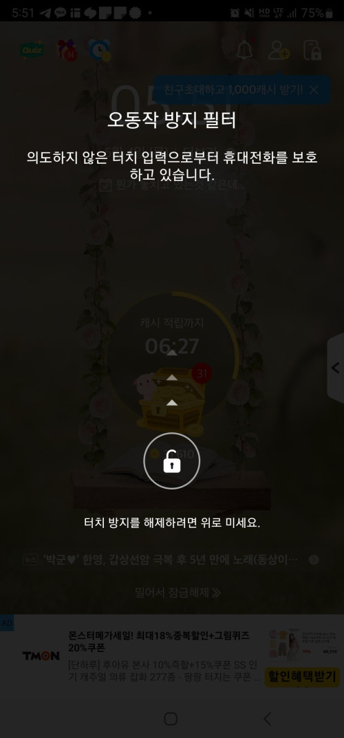 오동작 방지 필터가 적용되면 이런식으로 보이는데 문제는 오른쪽 으로 밀어 잠금을 해제하는 아이폰의 방식이 아닌 화살표 방향인 위로 밀어 잠금을 해제하는 방식입니다. 문제는 이게 적당히 밀어 해제가 되면 다행인데 적당히 밀어서는 해제가 안된다는 것입니다. 휴대폰 화면 끝까지 밀어야 잠금이 해제되며 이마저도 해제가 안될때가 간혹 있다는 문제가 있습니다.