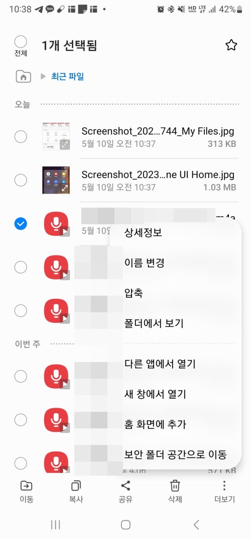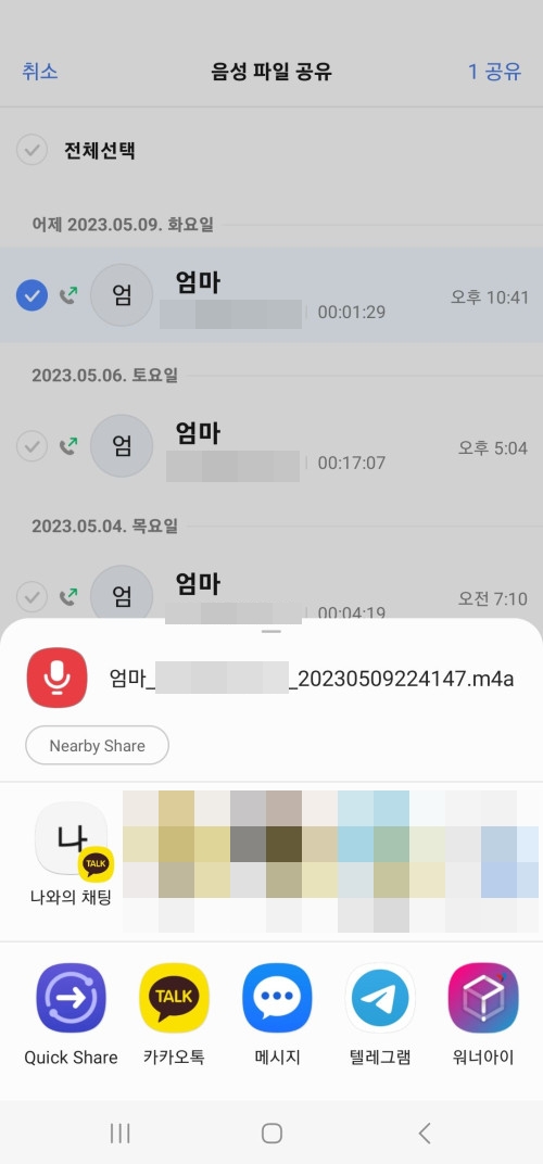 아무거나 선택하고 우측 상단 점을 눌러 음성파일 공유를 선택합니다.
