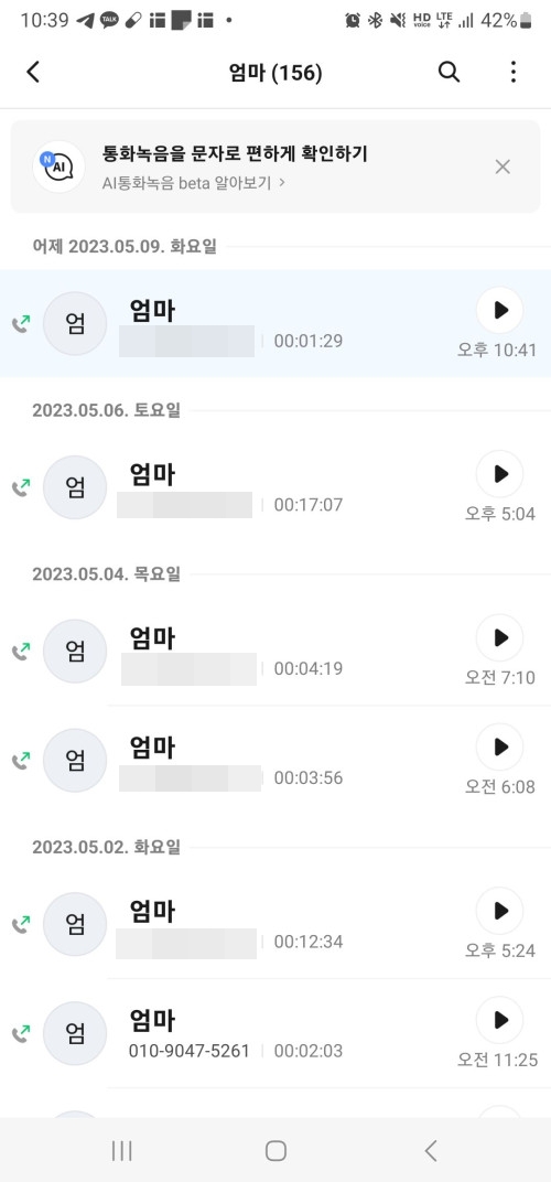 휴대폰에서 최근기록을 선택하고 원하는 전화번호를 선택하면 통화녹음이 활성화 되었다고 가정할 경우 이렇게 기록마다 통화녹음이 존재합니다.