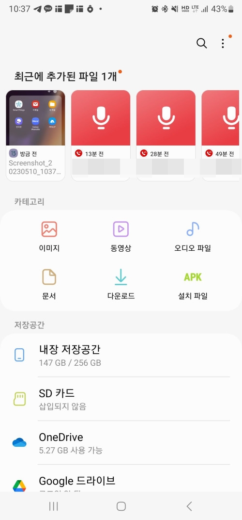 1. 내 파일 앱 실행 ▶ 내장 저장공간 ▶ 최근파일에서 통화녹음 파일 확인