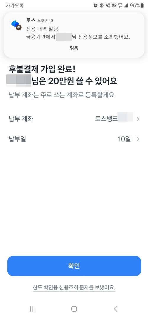 신용조회 후 사용가능 금액이 책정되는데 30만원이 아닌 20만원 사용이 가능하다고 나옵니다. 왜 그런지는 저도 모르겠습니다. 어짜피 실제 사용을 하지 않을 예정이라 딱히 상관은 없네요.