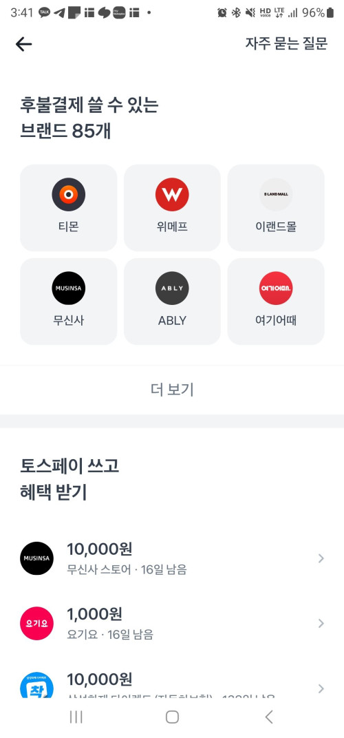 토스는 네이버페이와 비슷하게 후불결제를 지원하고 있습니다. 후불결제라는게 카드결제와는 비슷하지만 카드와는 별개로 진행이 되기 때문에 본인이 사용하던 카드의 한도가 다 되었더라도 상관없이 사용할 수 있다는 점에서는 나쁘지 않을 수도 있습니다. 하지만 결국 이는 빚을 지는 행위다보니 함부로 사용하기도 좀 그런 양날의 검이라고 할 수 있습니다.