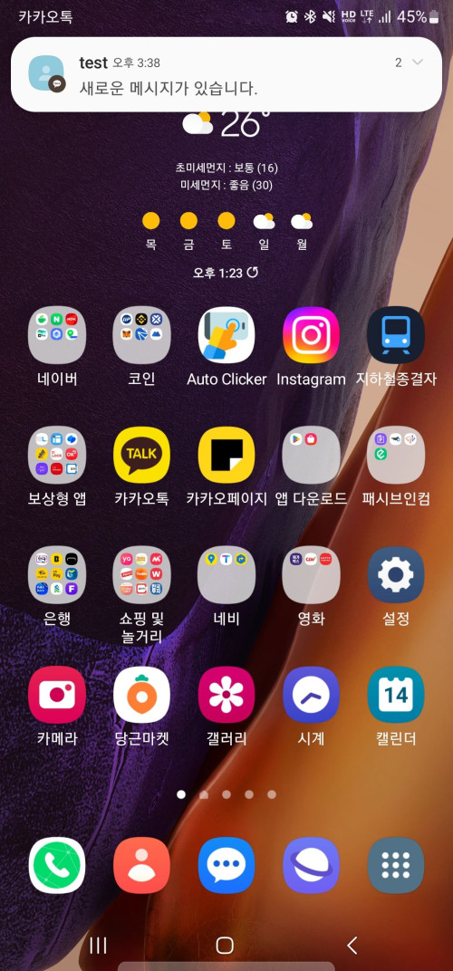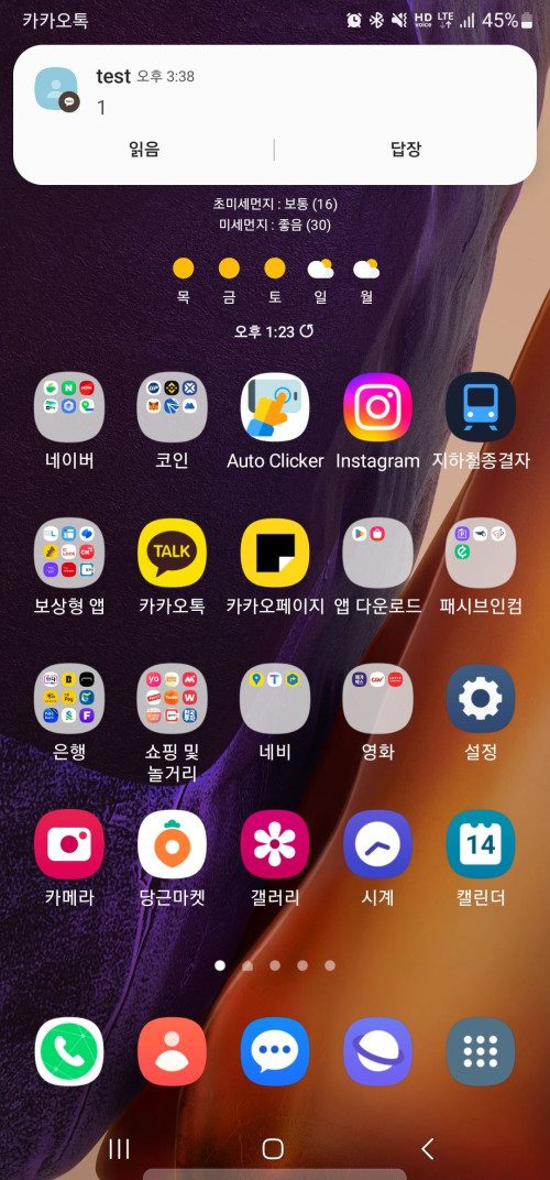 갤럭시 휴대폰은 잠금화면이거나 아니거나 알림 내용을 미리 상단 팝업 형태로 띄워 볼 수 있도록 설정할 수 있는데 설정이 모두 정상임에도 불구하고 팝업이 뜨지 않는다면 카카오톡 PC버전이 켜져 있는지 확인해야 합니다. PC카톡이 켜져있는 상태라면 상단 팝업은 뜨지 않으며 설정이 100% 정상이라면 메세지가 상단에 무조건 뜨기 때문입니다.