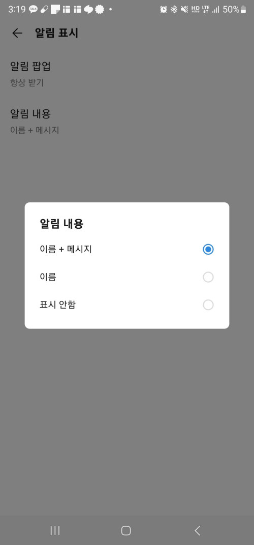 알림 내용에 이름 + 메세지 / 이름 둘 중 하나를 선택할 수 있는데 전자는 메세지가 전부 보여지는 것이며 후자는 누구에게 메세지가 왔다라는 것만을 확인할 수 있습니다.