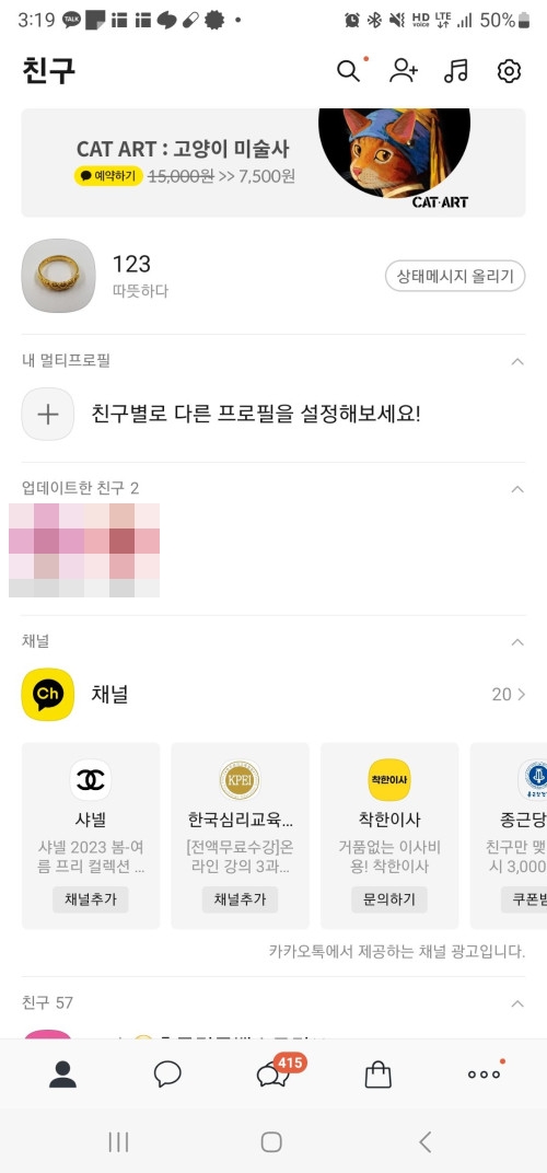 스마트폰을 이용하며 카카오톡은 일상생활에 없어서는 중요한 수단이 되었습니다. 초기 점유율이 지금까지 이어졌다고 할까요? 다른 대체제가 어느정도 있지만 카카오톡 내 광고 행위나 카카오계열사의 문어발식 확장은 보는사람으로 하여금 불쾌감을 주고 있지만 그렇다고 나만 사용안하면 되는일이 아니기에 오늘도 눈물을 머금고 카톡을 오픈합니다.
