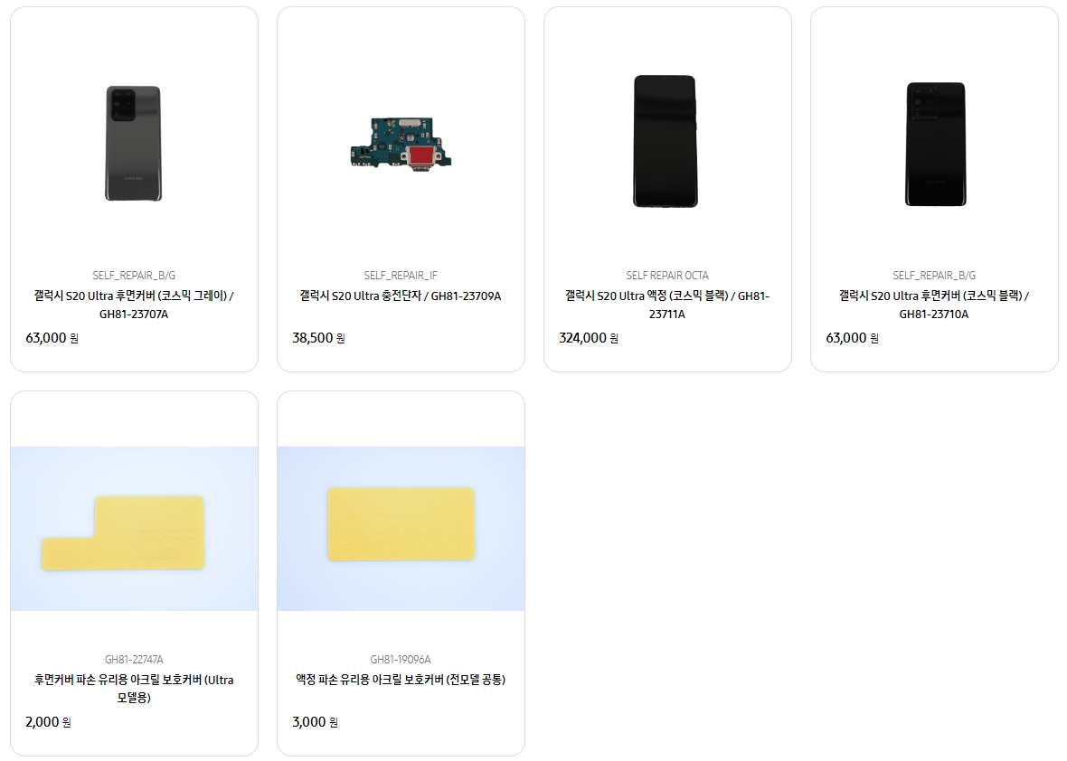 이후 본인의 상태를 확인하여 부품 가격을 지불하고 메뉴얼에 따라 수리를 진행하면 되는데 수리가 가능한 부품 종류로는 충전단자/후면케이스/액정 3가지가 있습니다. 그 외에 갤럭시북 일부모델과 일부 TV모델 역시 수리부품을 지원하고 있습니다.