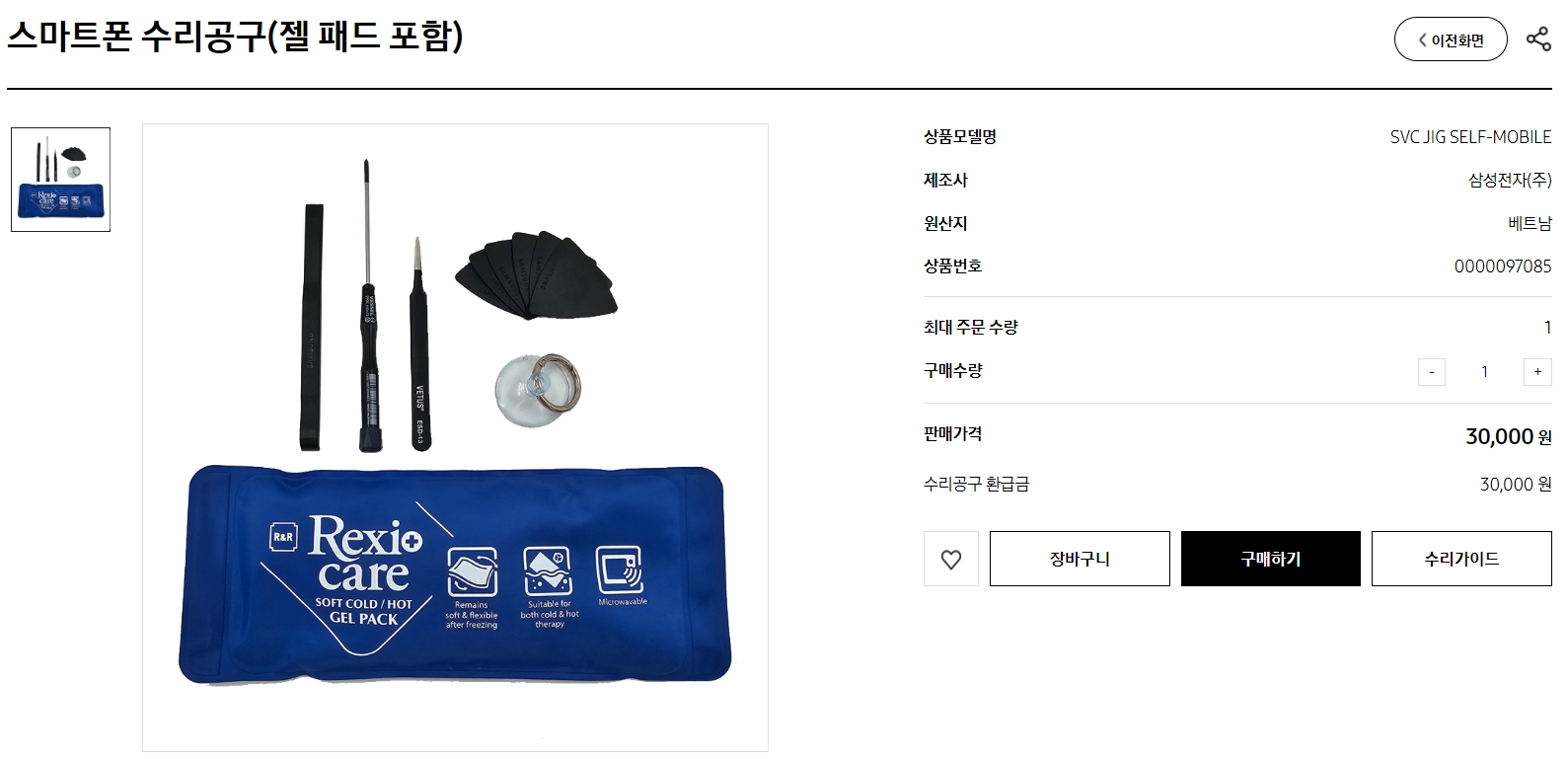 삼성전자서비스 홈페이지에서 스마트폰 수리공구를 구매합니다. 3만원의 비용이 발생하지만 30일 이내 반납시 구매금액을 환급해주기 때문에 사실상 택배비만 발생한다고 생각하시면 됩니다.